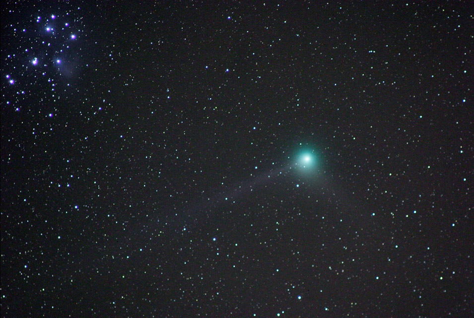 Der Komet C/2004 Q2 Machholz bei dem offenen Sternhaufen M45.